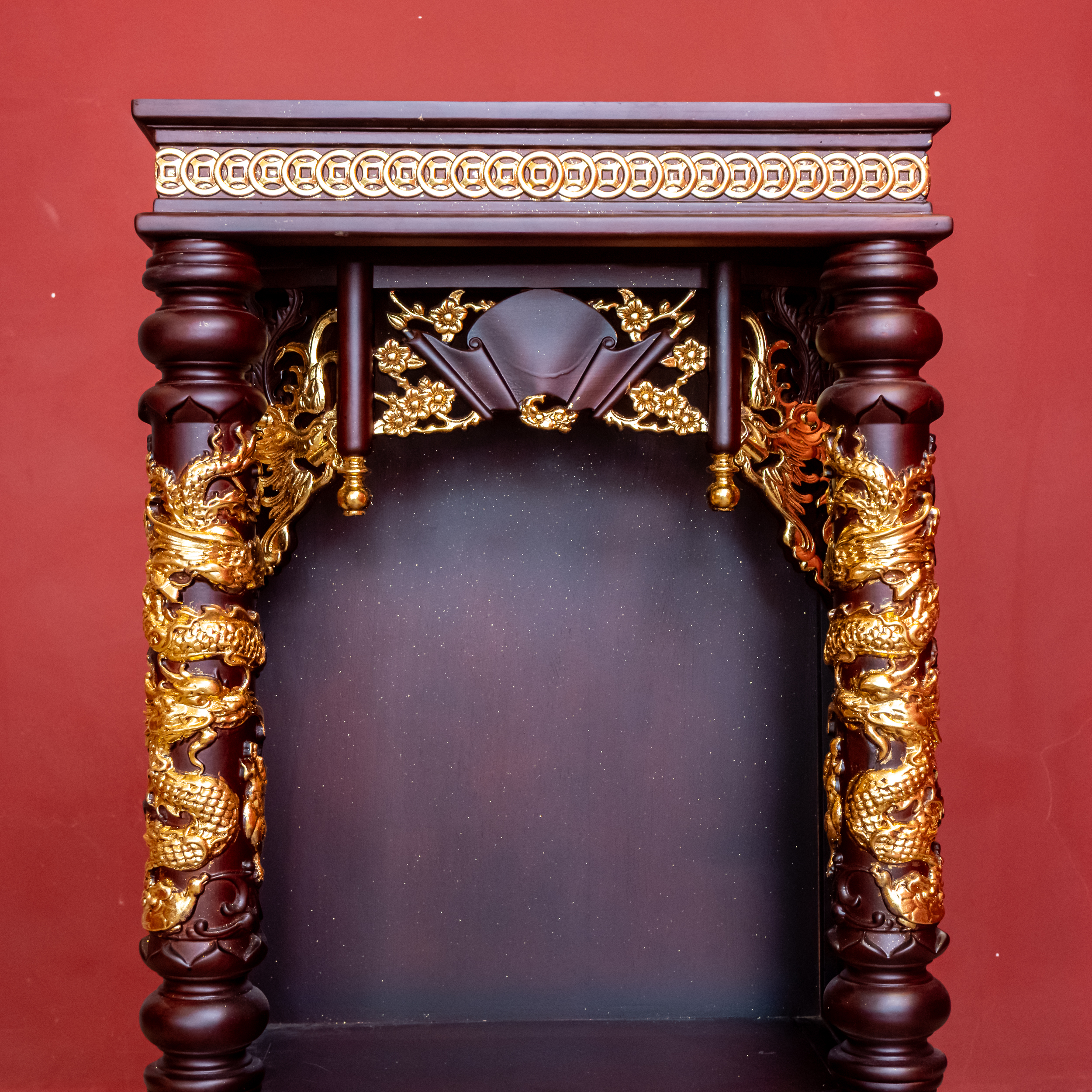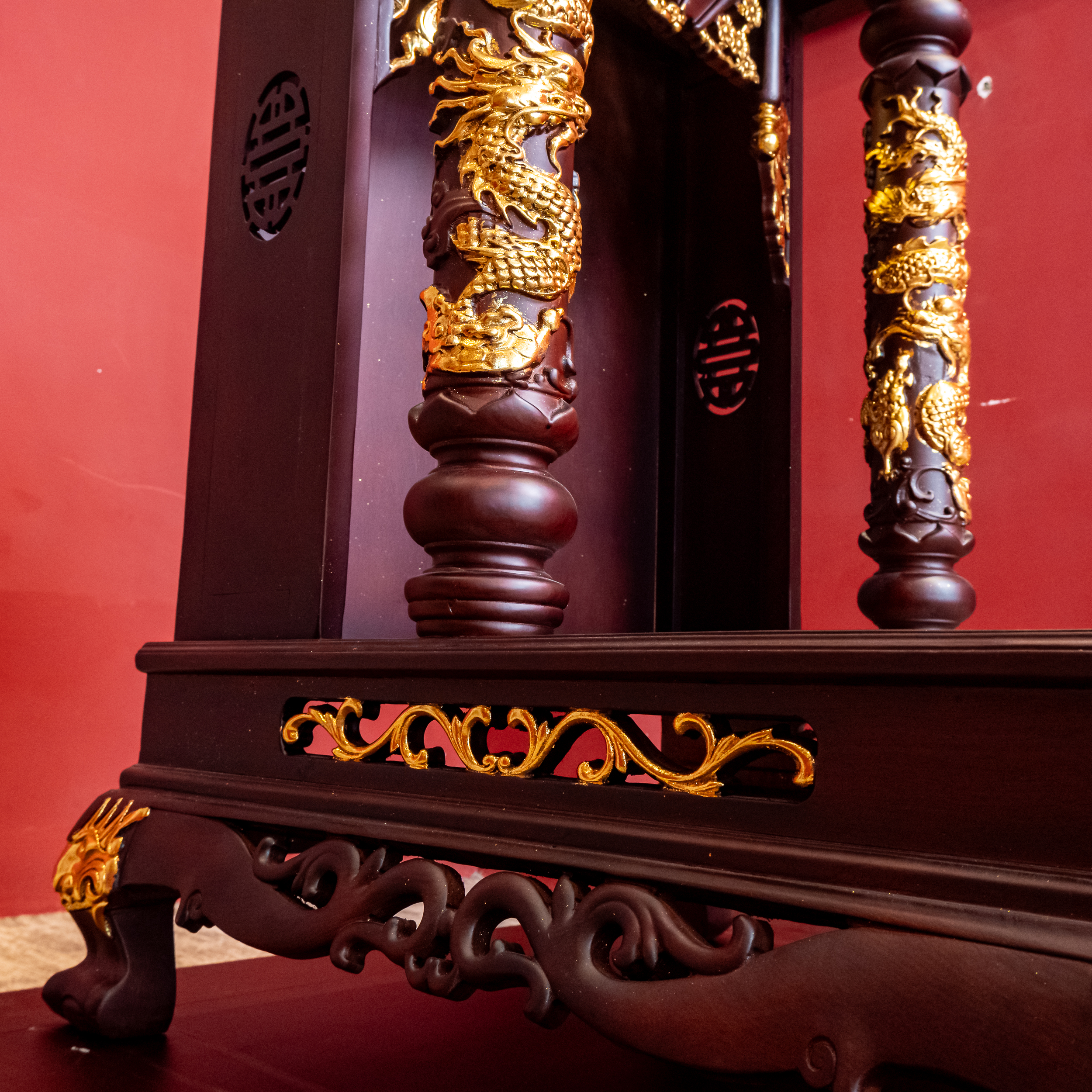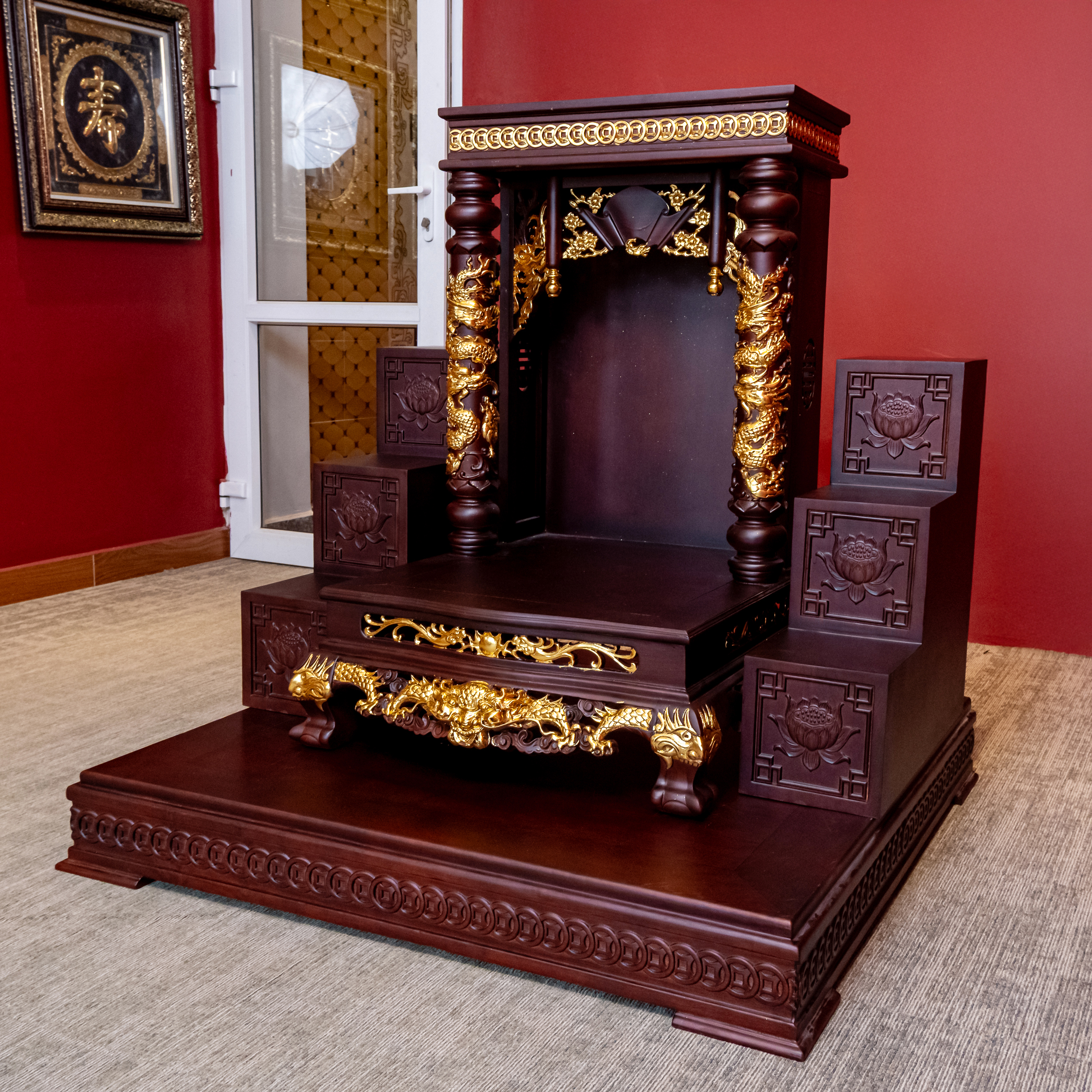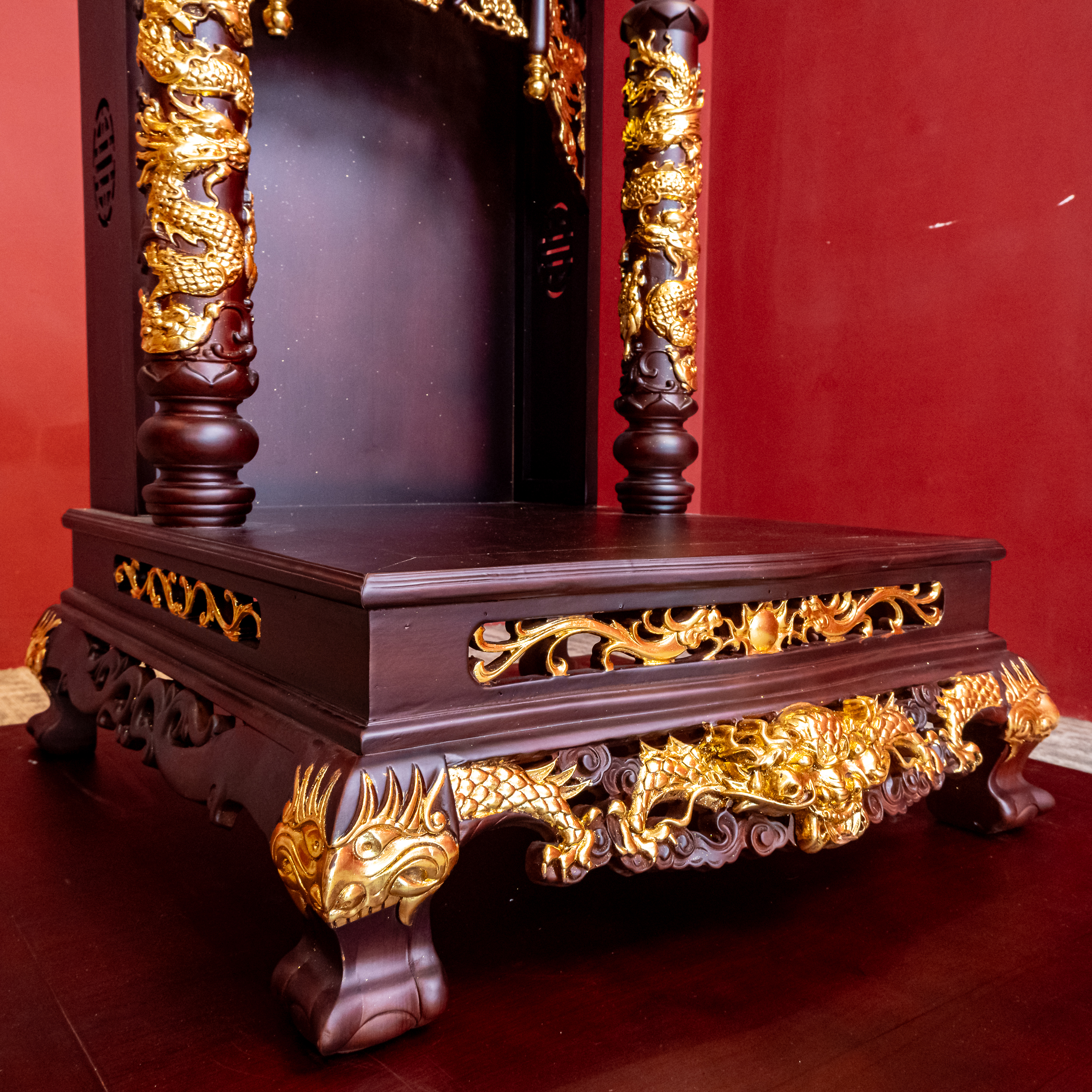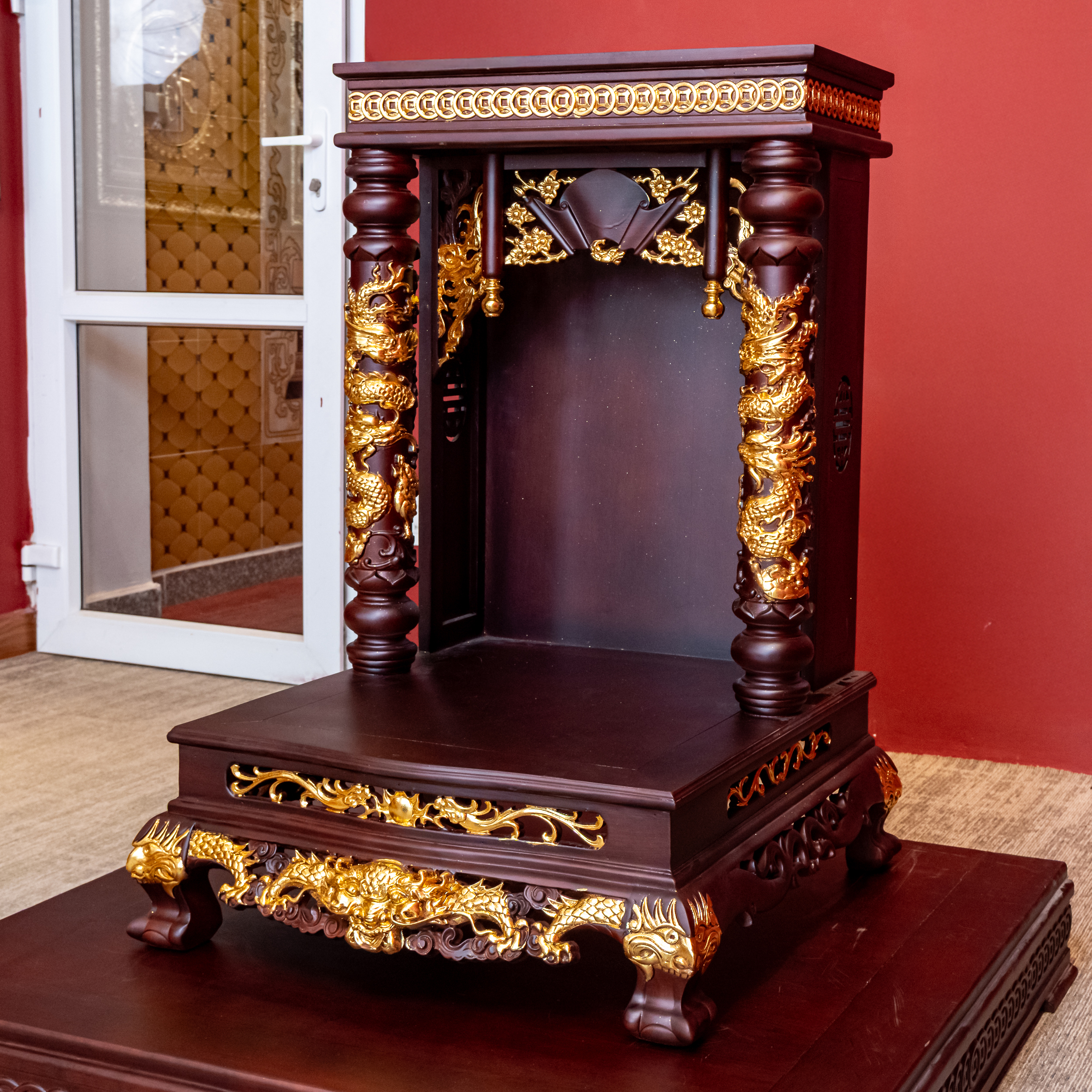 – Tên SP: Ban Thần Tài Gỗ Hương Mái Bằng Cột Tròn Khắc Rồng Nổi Dát Vàng