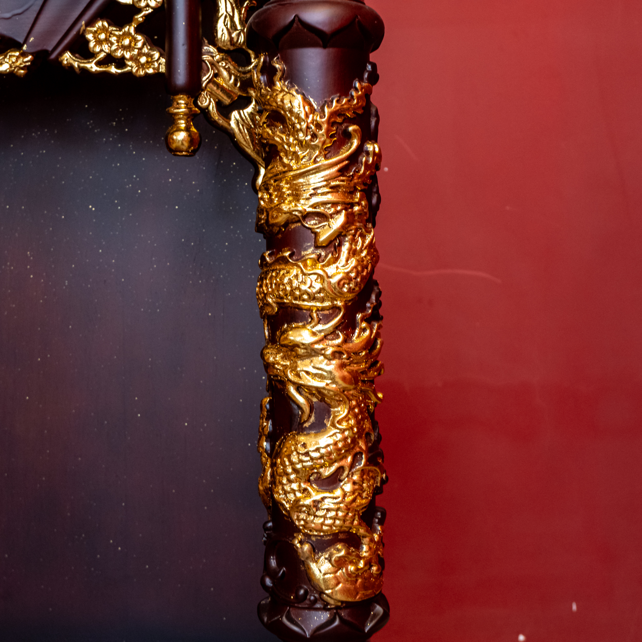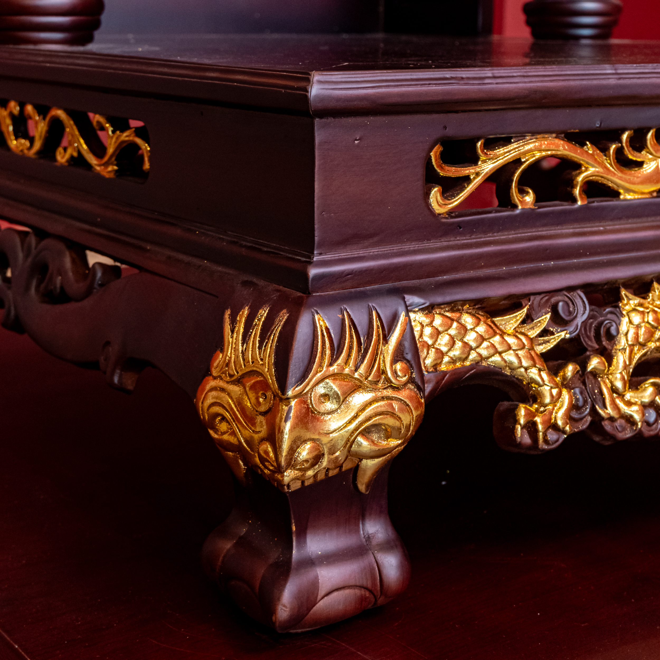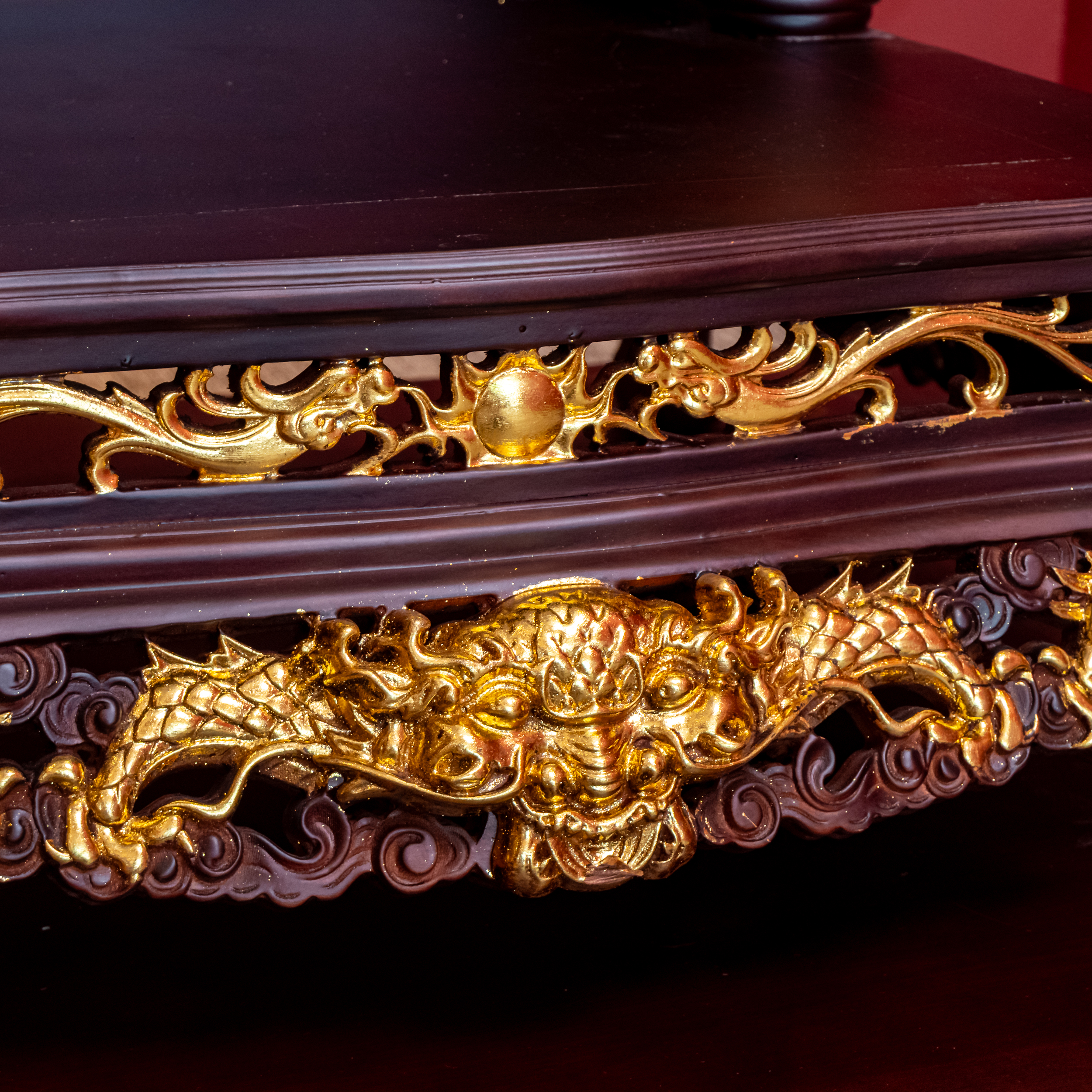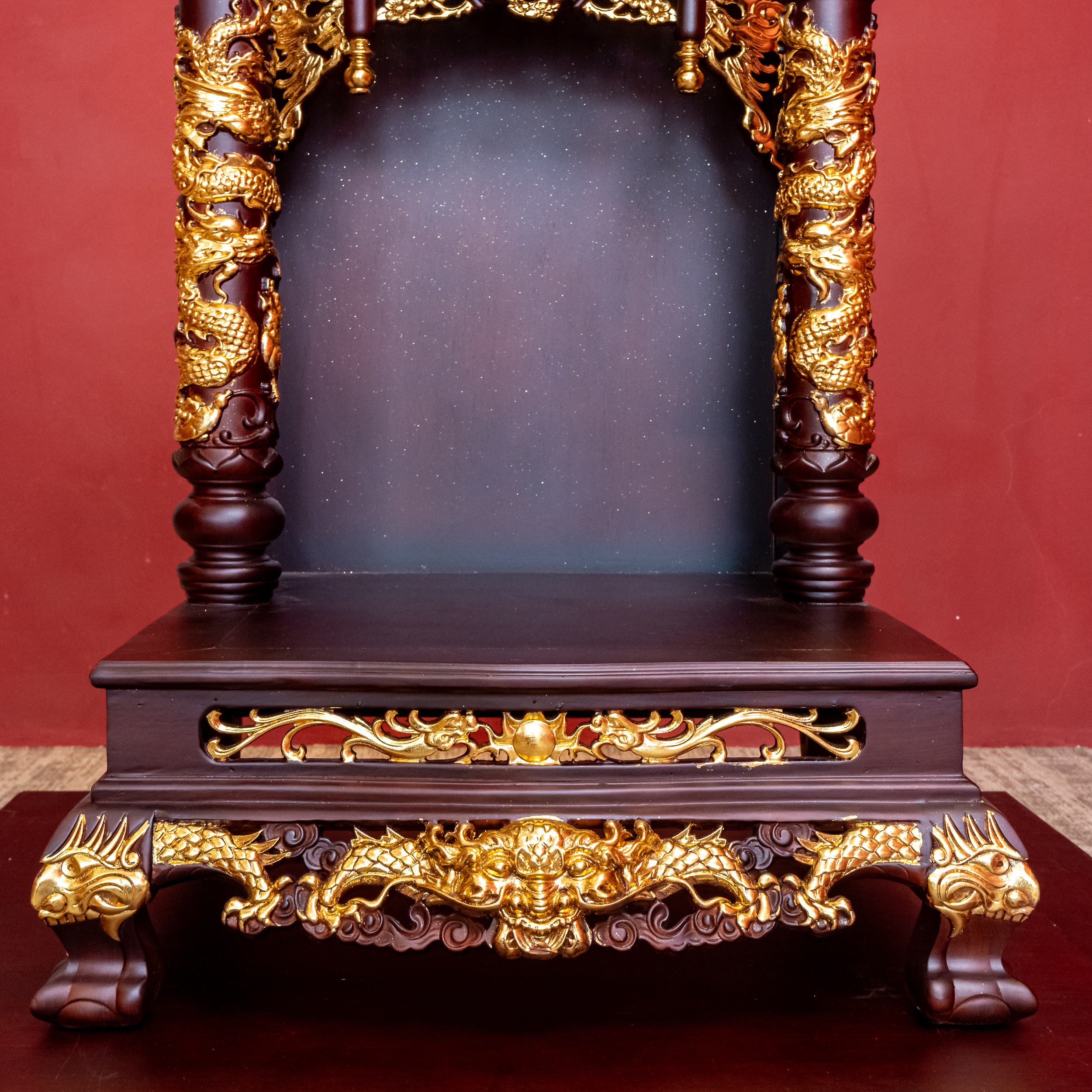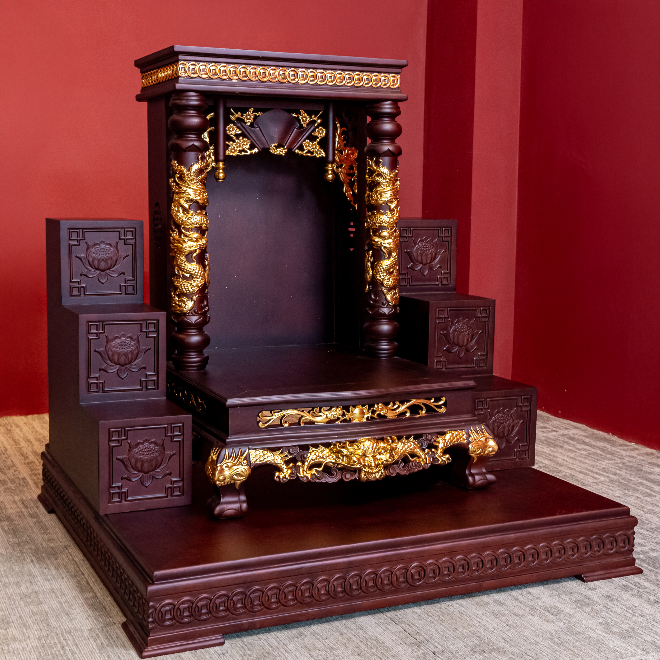 – Tên SP: Ban Thần Tài Gỗ Hương Mái Bằng Cột Tròn Khắc Rồng Nổi Dát Vàng