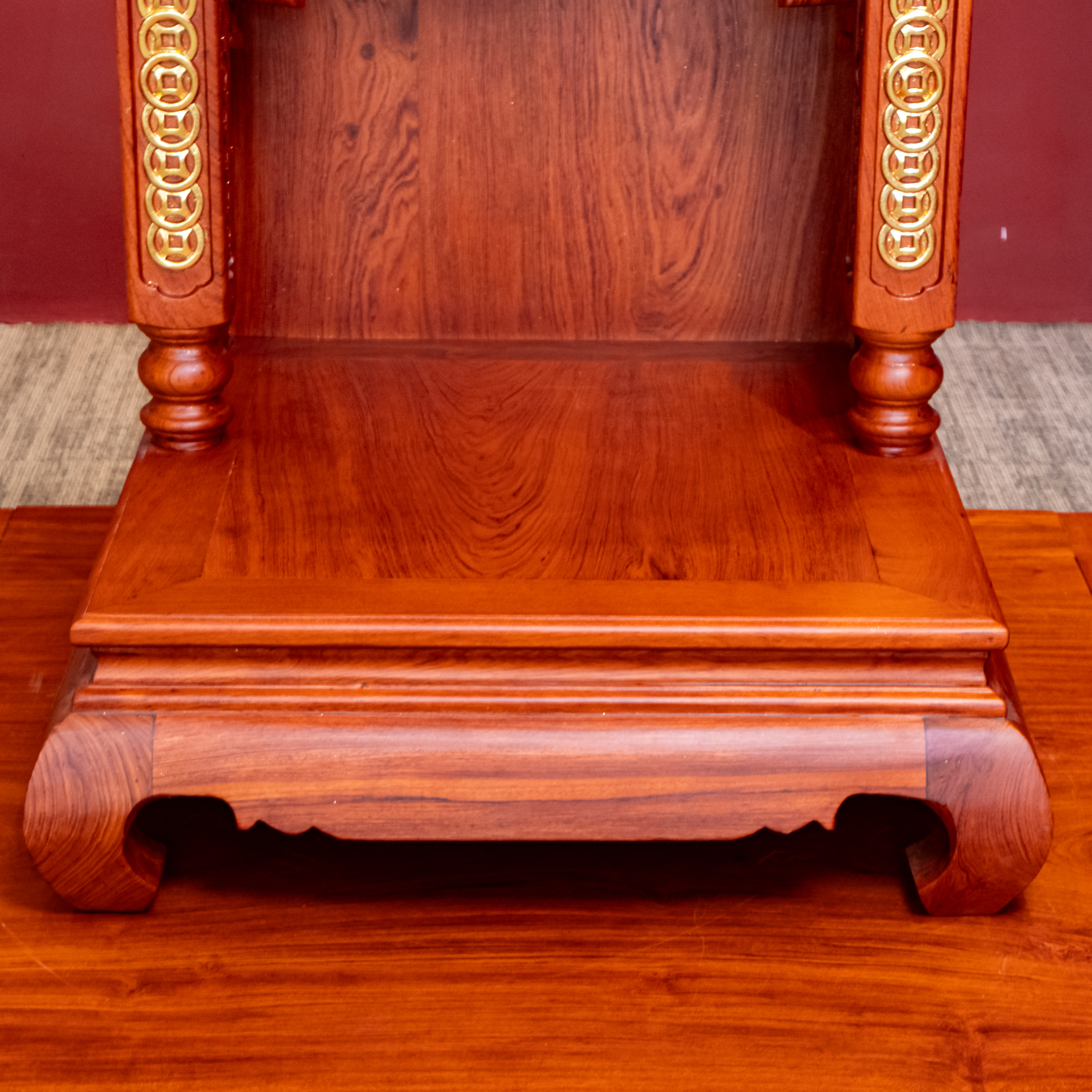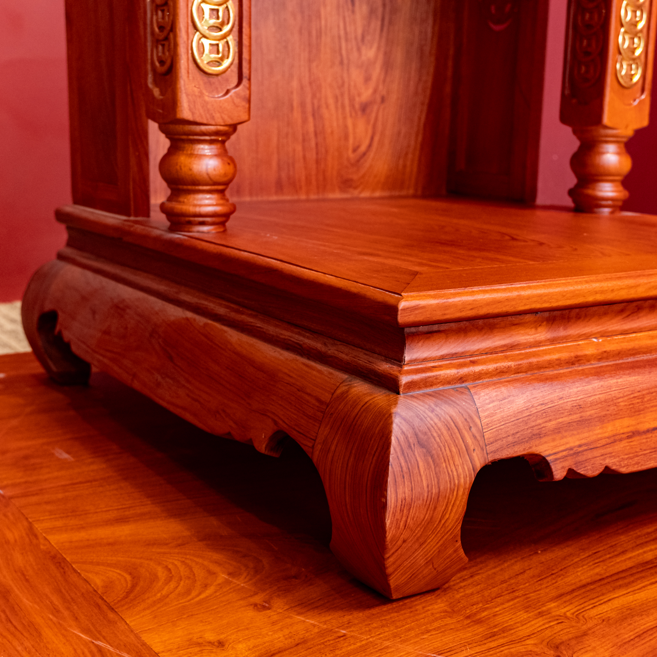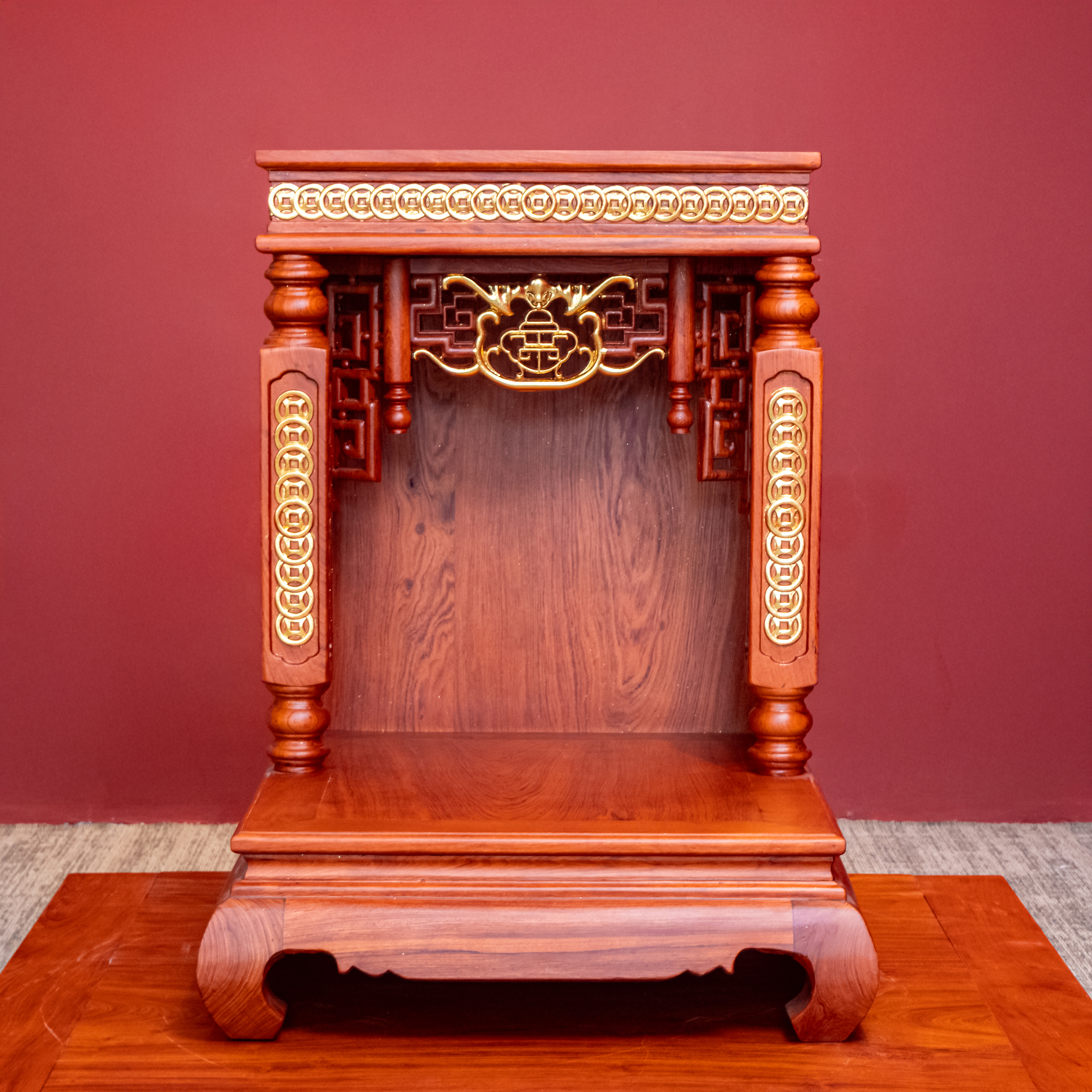 – Tên SP: Ban Thờ Thần Tài Thổ Địa Gỗ Hương Mái Bằng Cột Vuông Dát Vàng – Hương Sáng