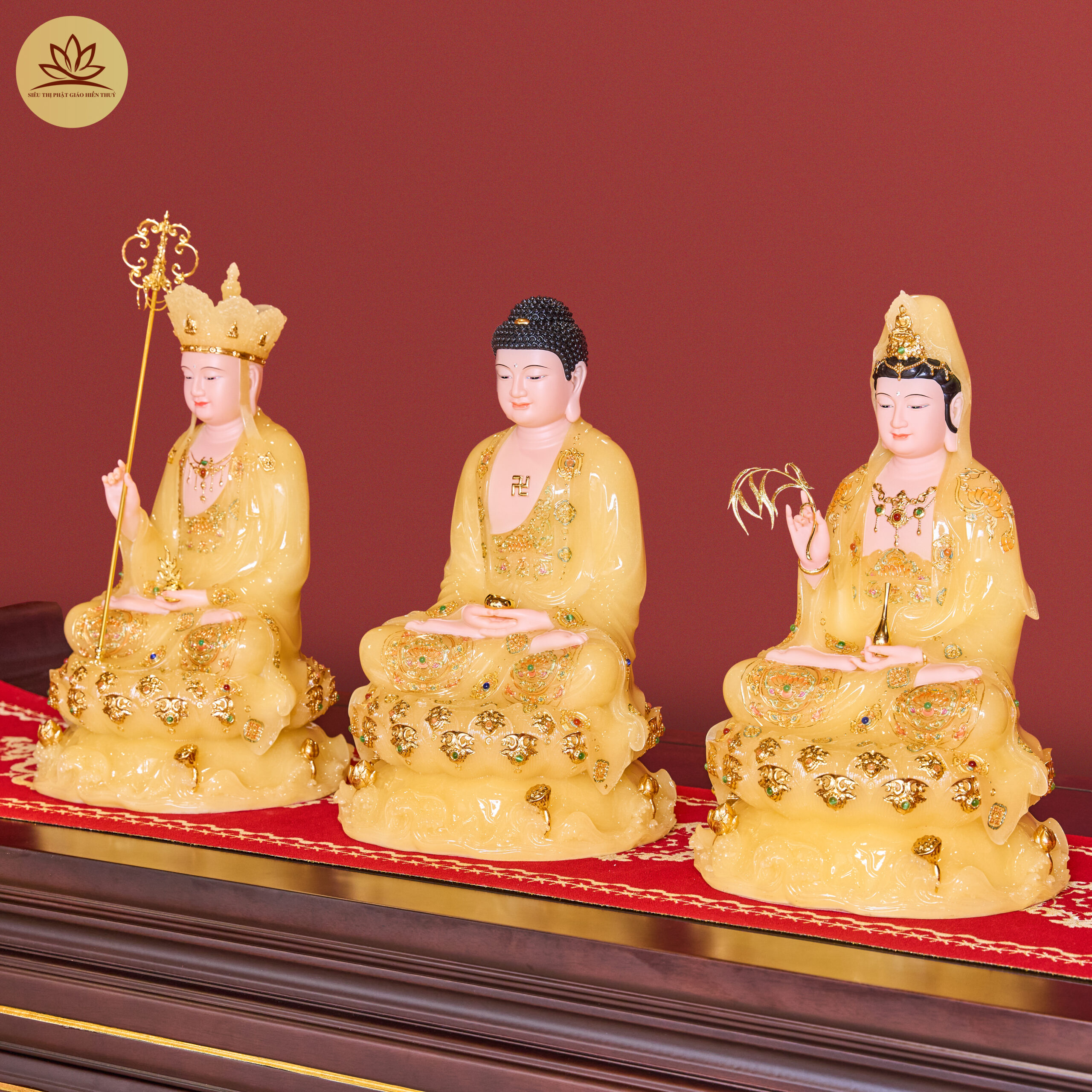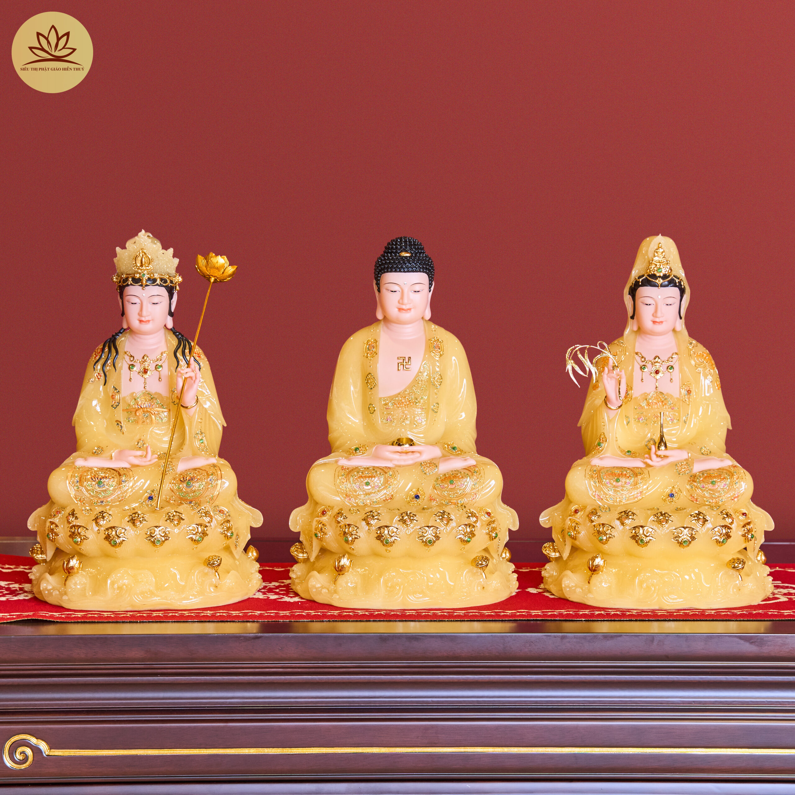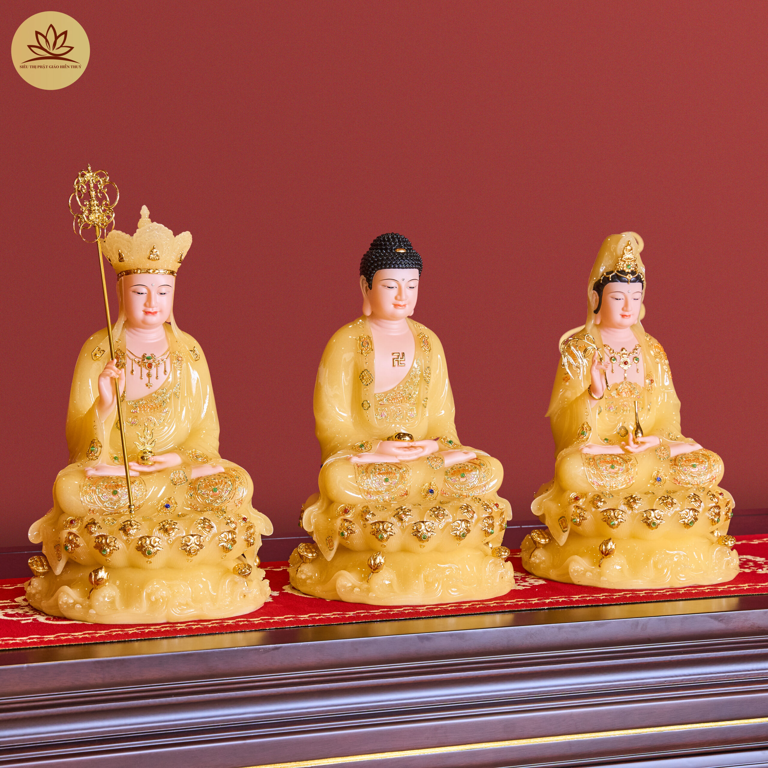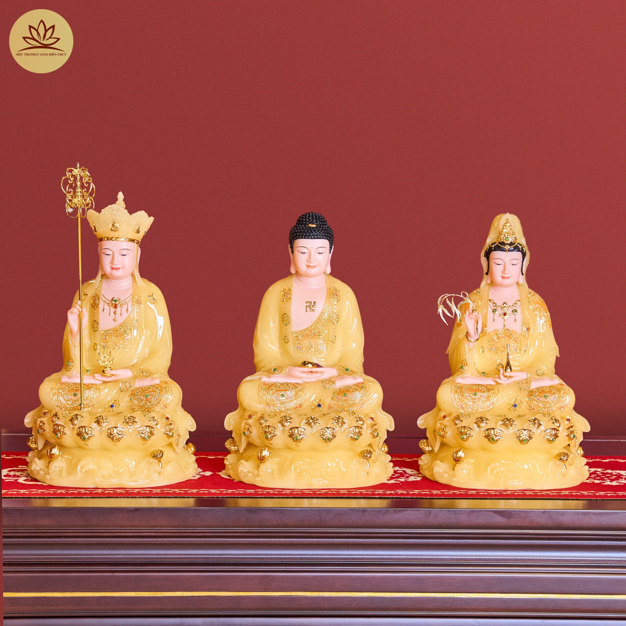 – Tên SP: Tượng Ta Bà Tam Thánh Bột Đá Toạ Đài Sen Thạch Anh Vàng
