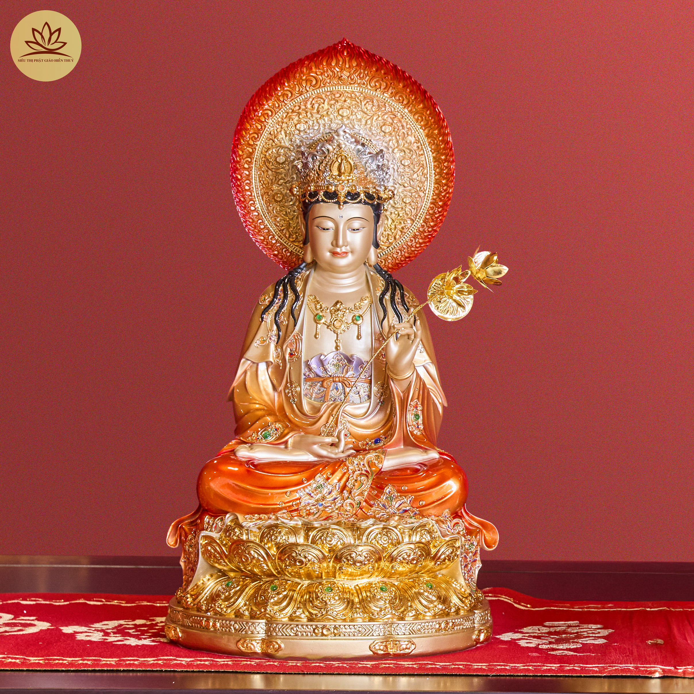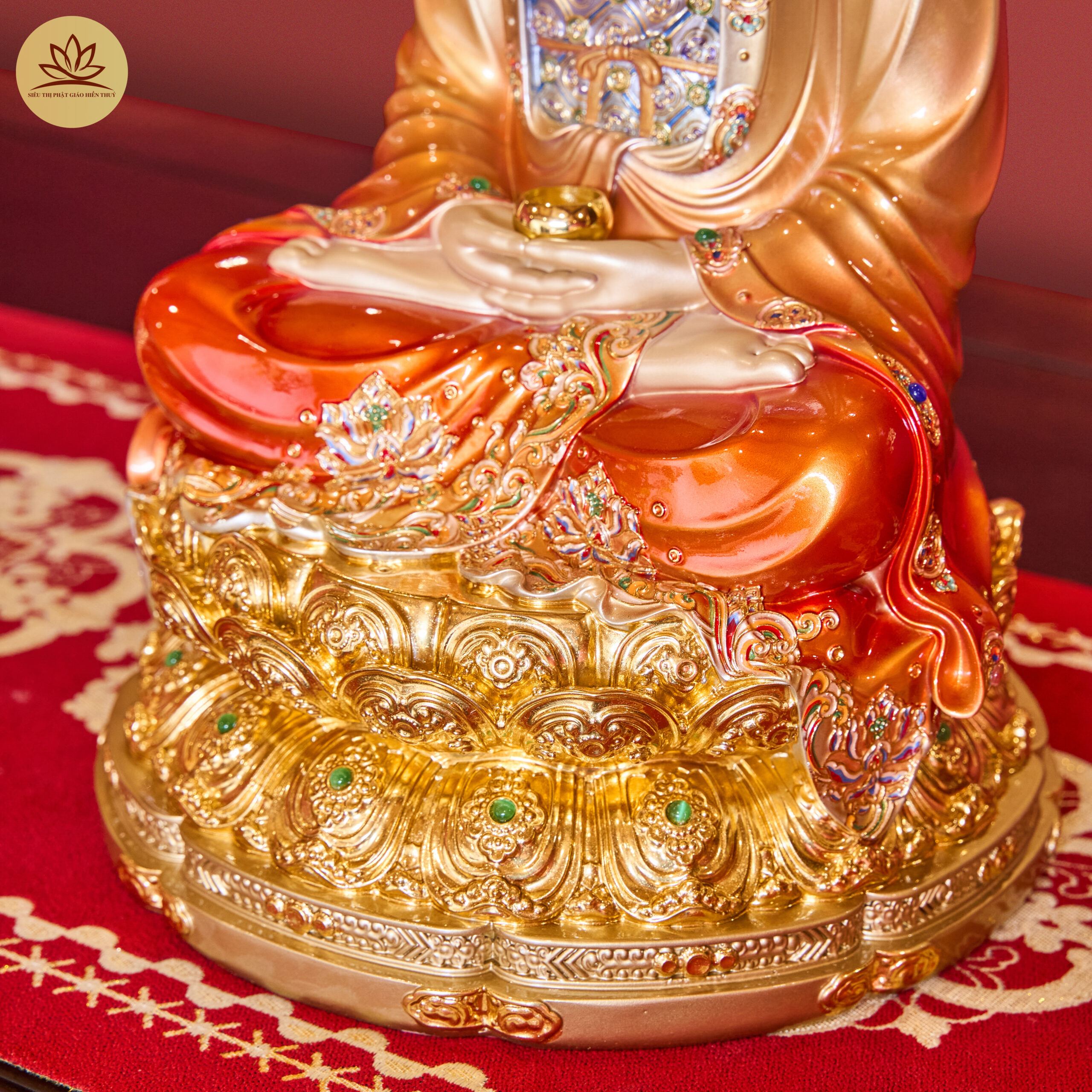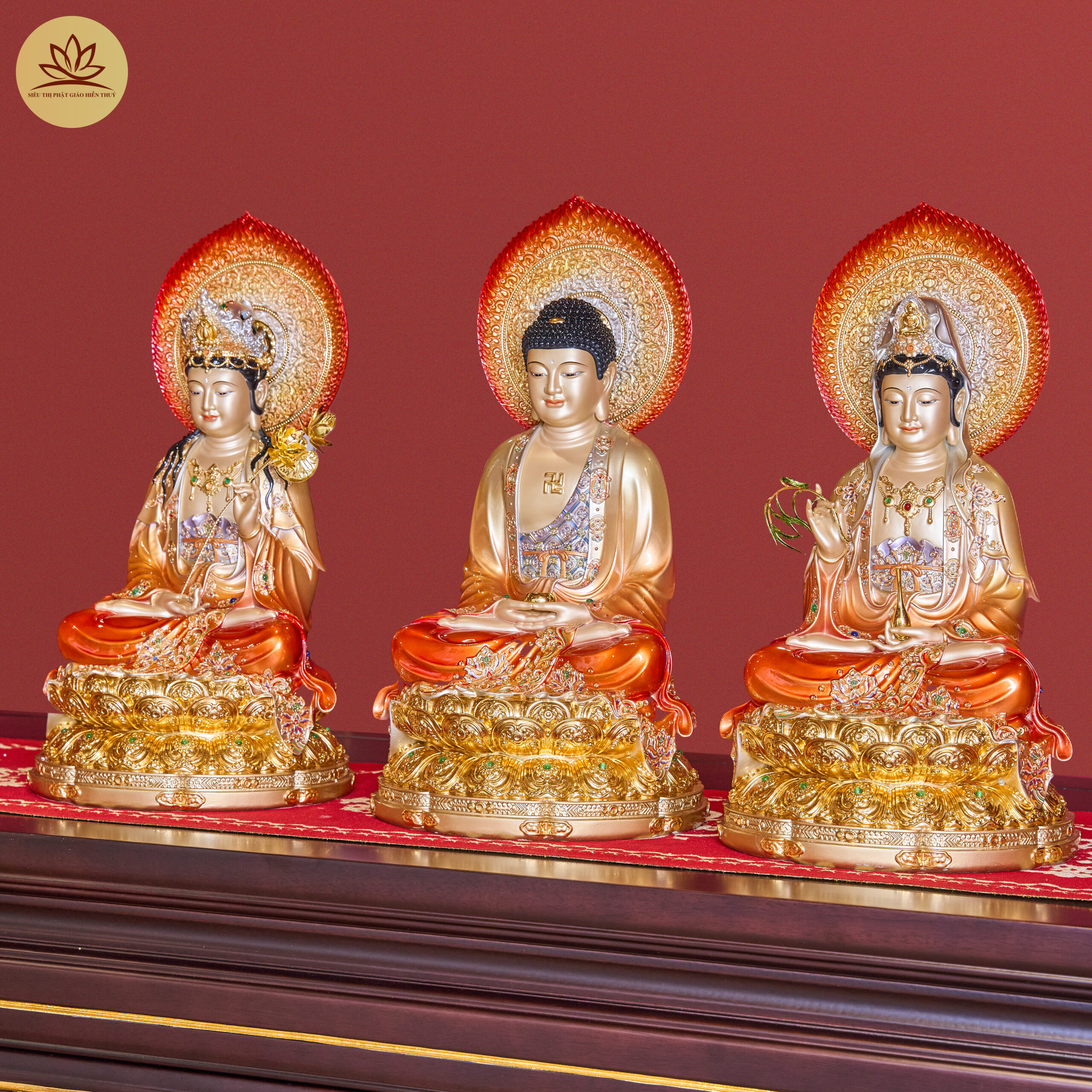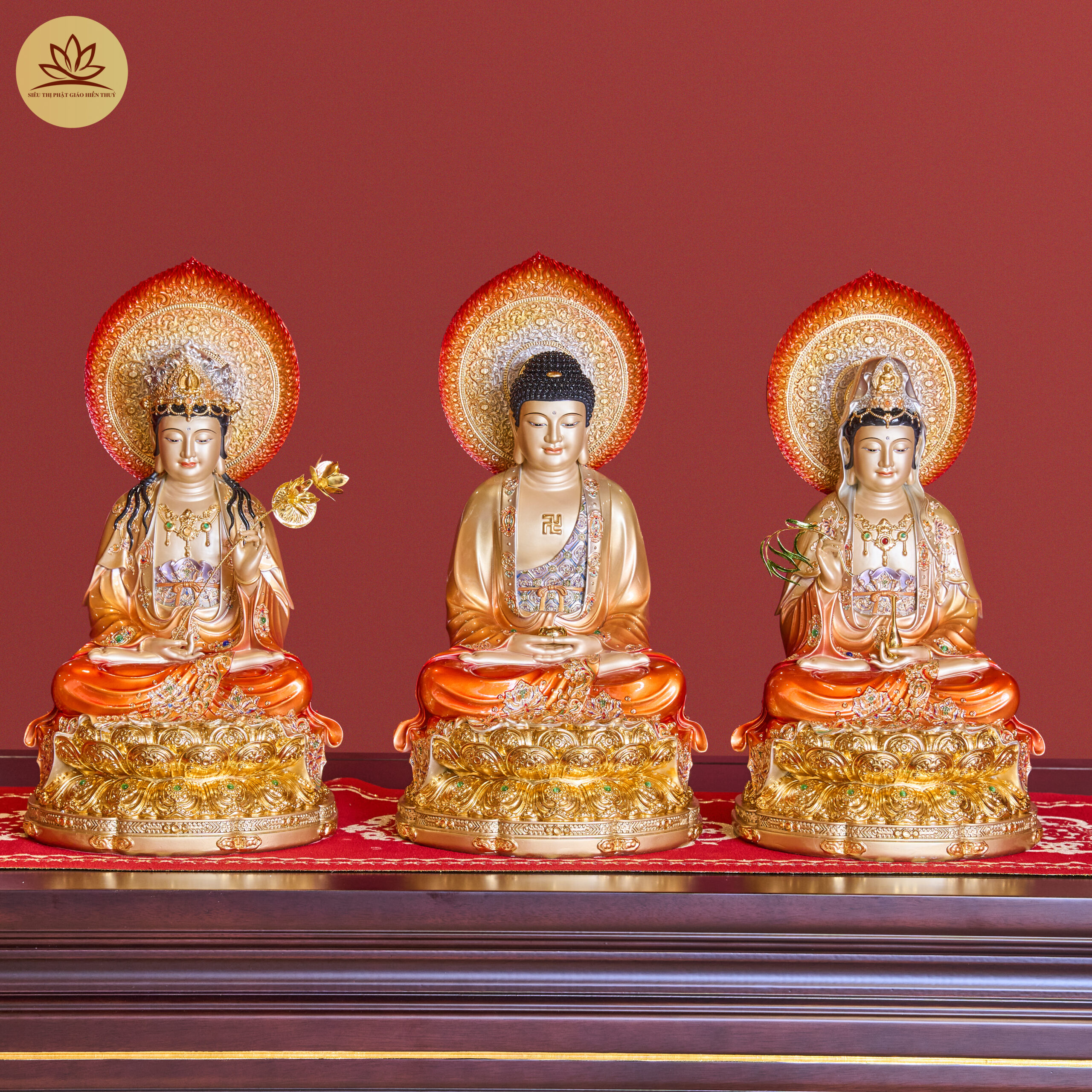 Tượng Tây Phương Tam Thánh Đá Hiệu Ứng Đồng Tọa Đài Sen Đỏ Ánh Kim Dát Vàng Có Lá Đề