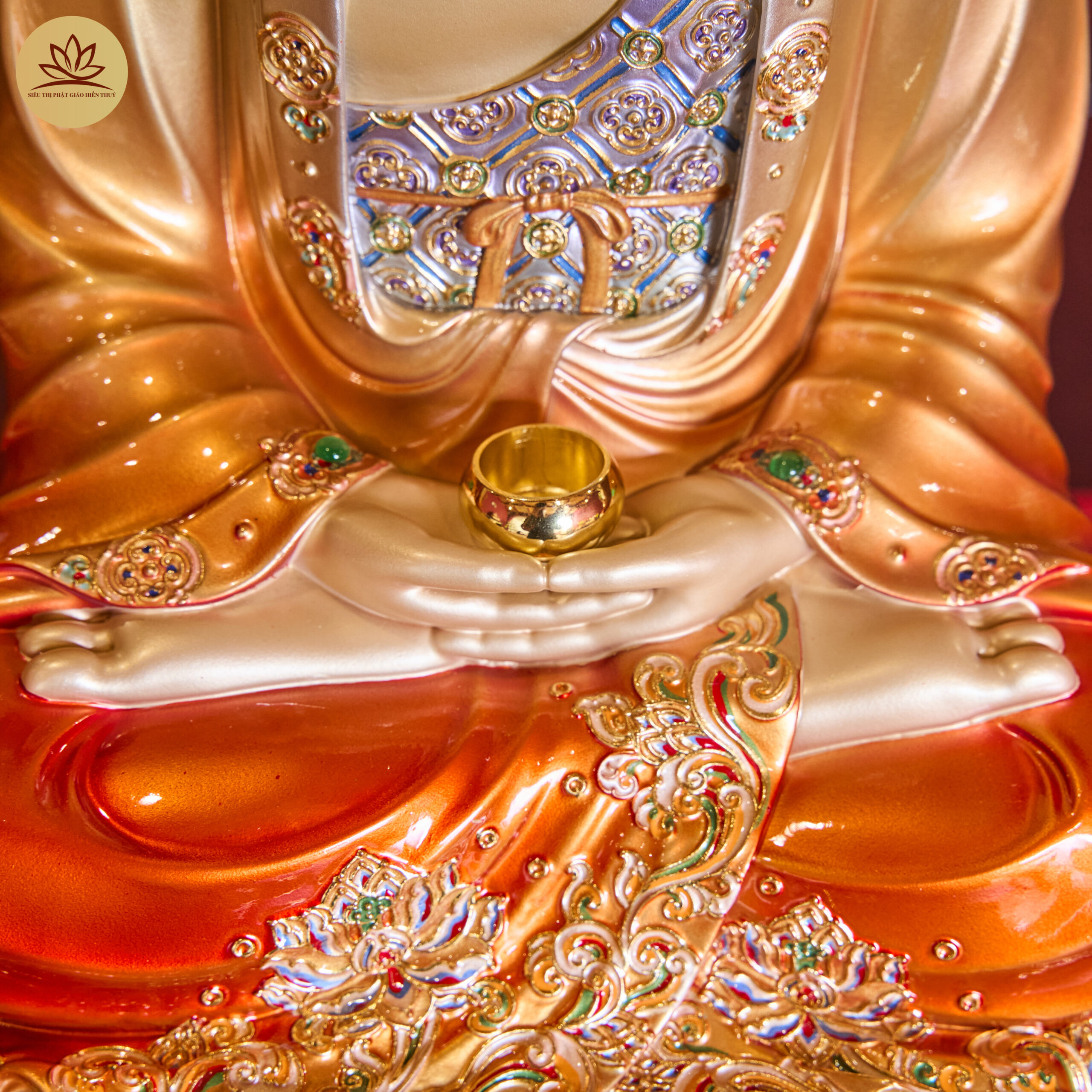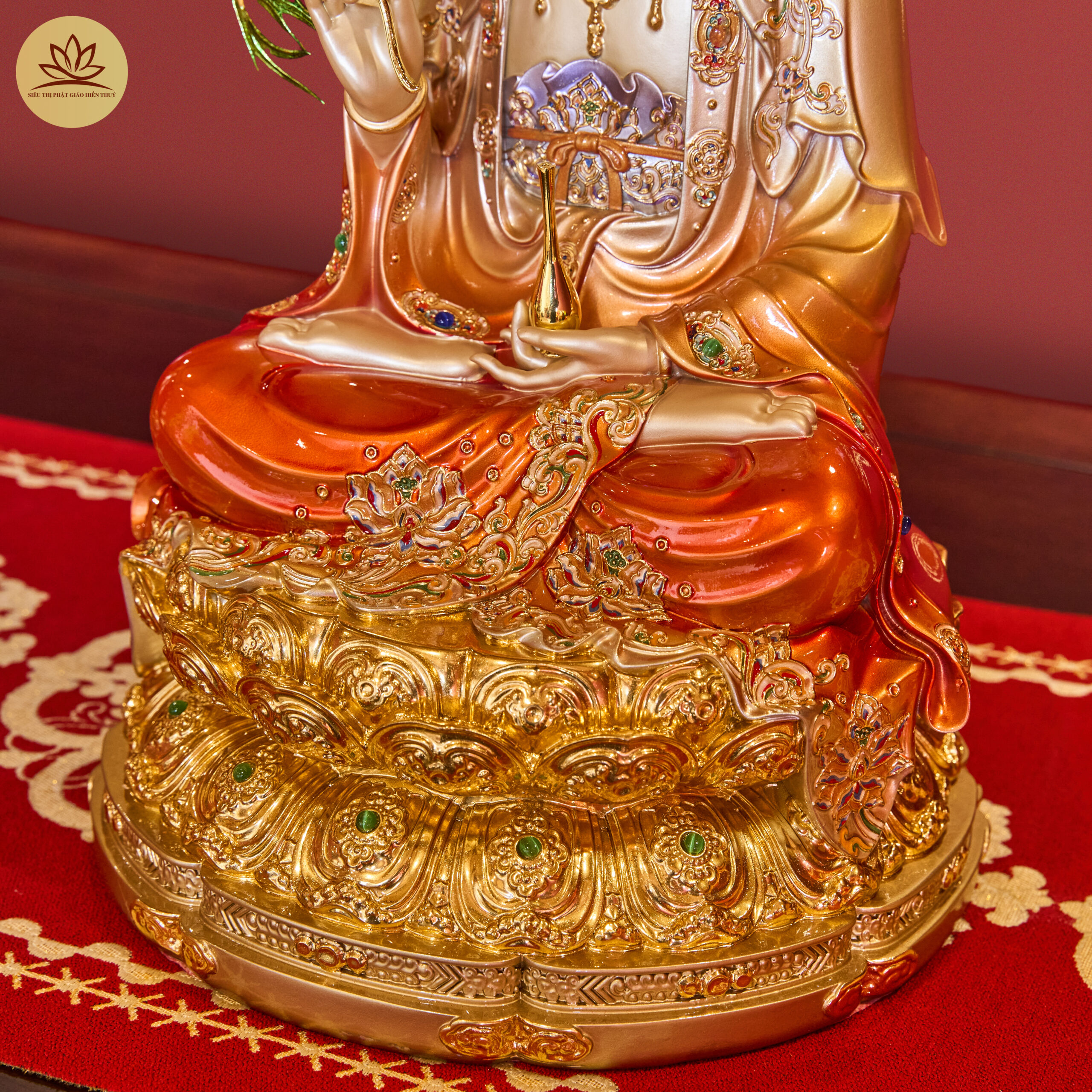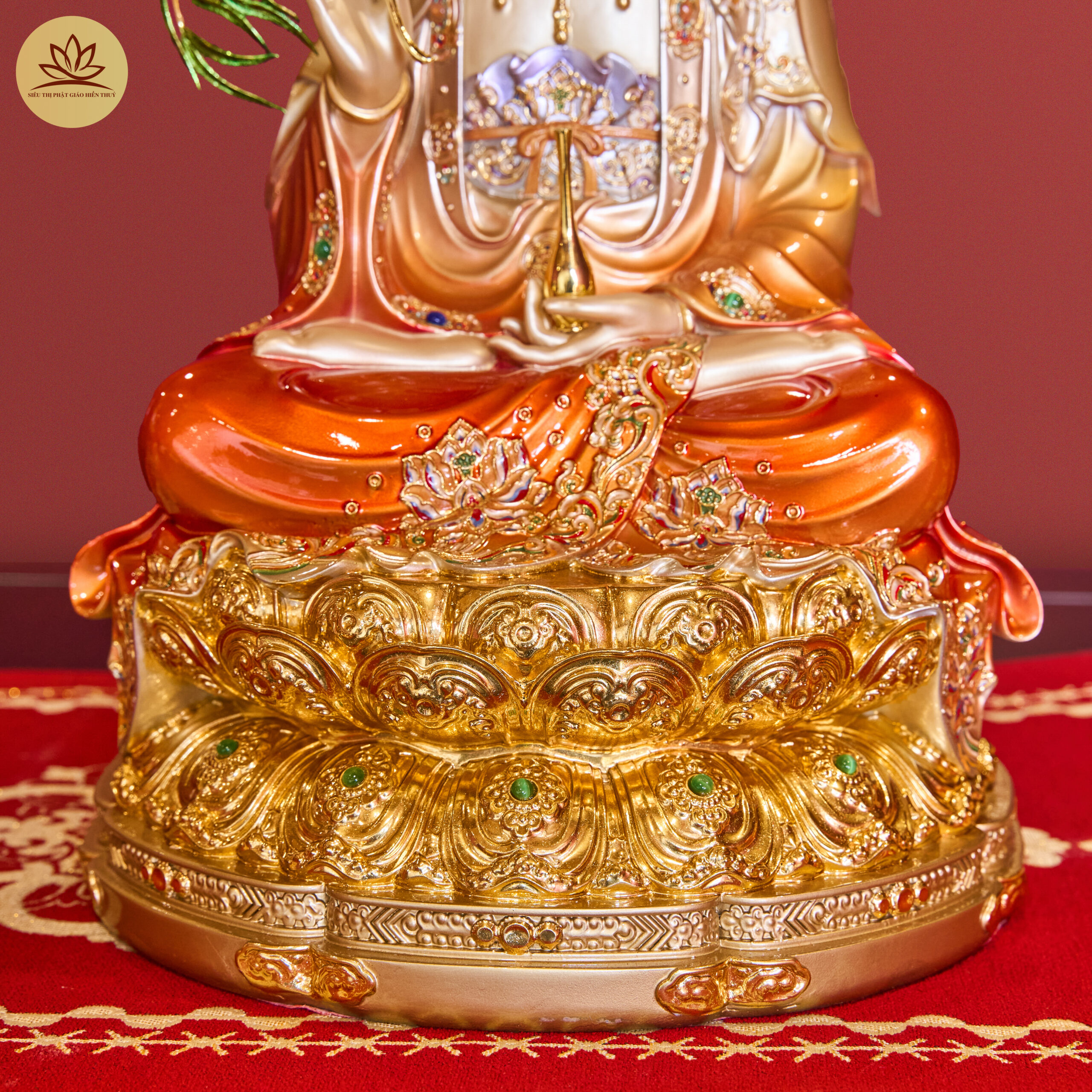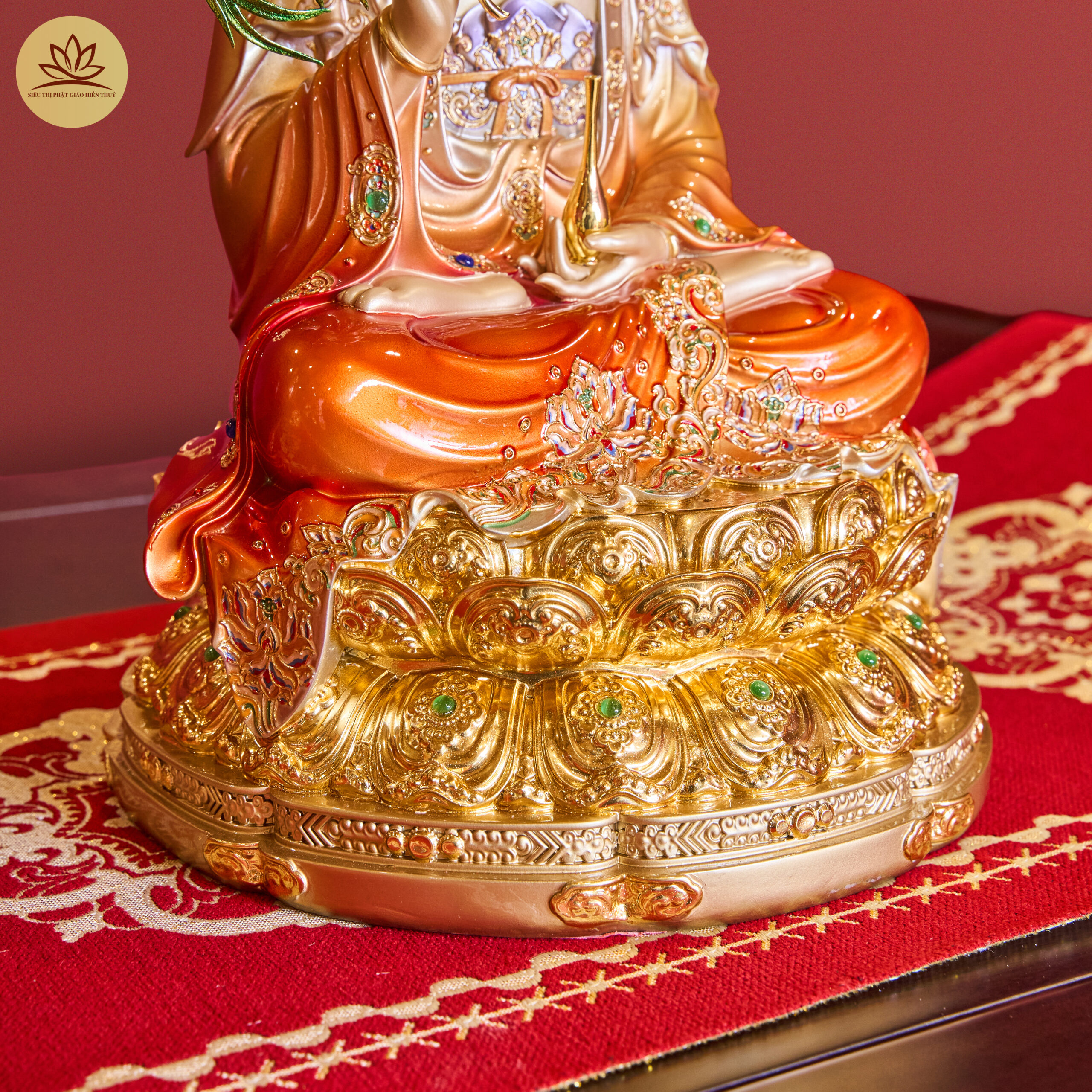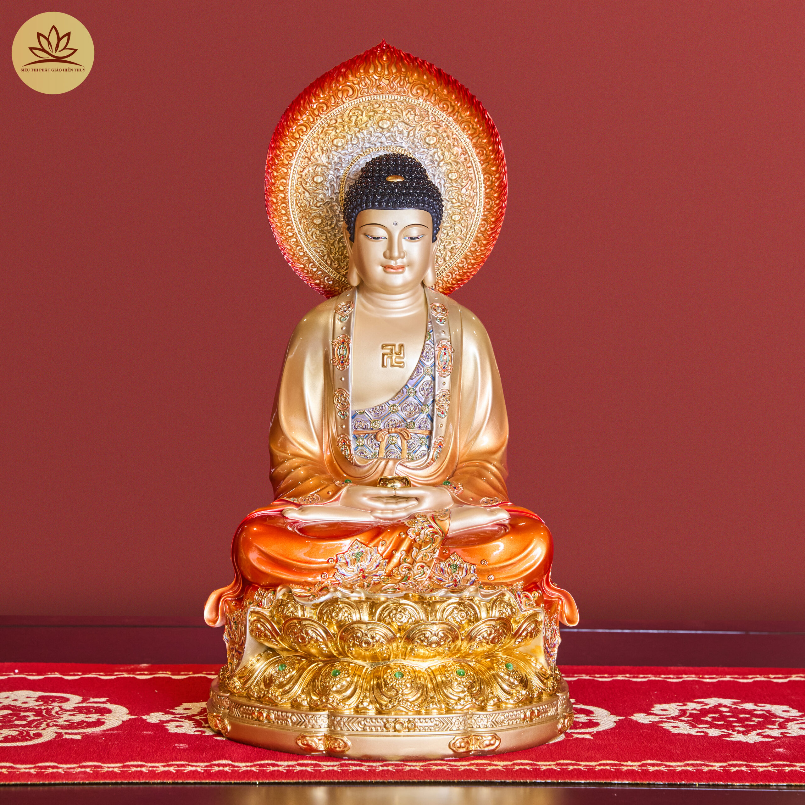 Tượng Tây Phương Tam Thánh Đá Hiệu Ứng Đồng Tọa Đài Sen Đỏ Ánh Kim Dát Vàng Có Lá Đề